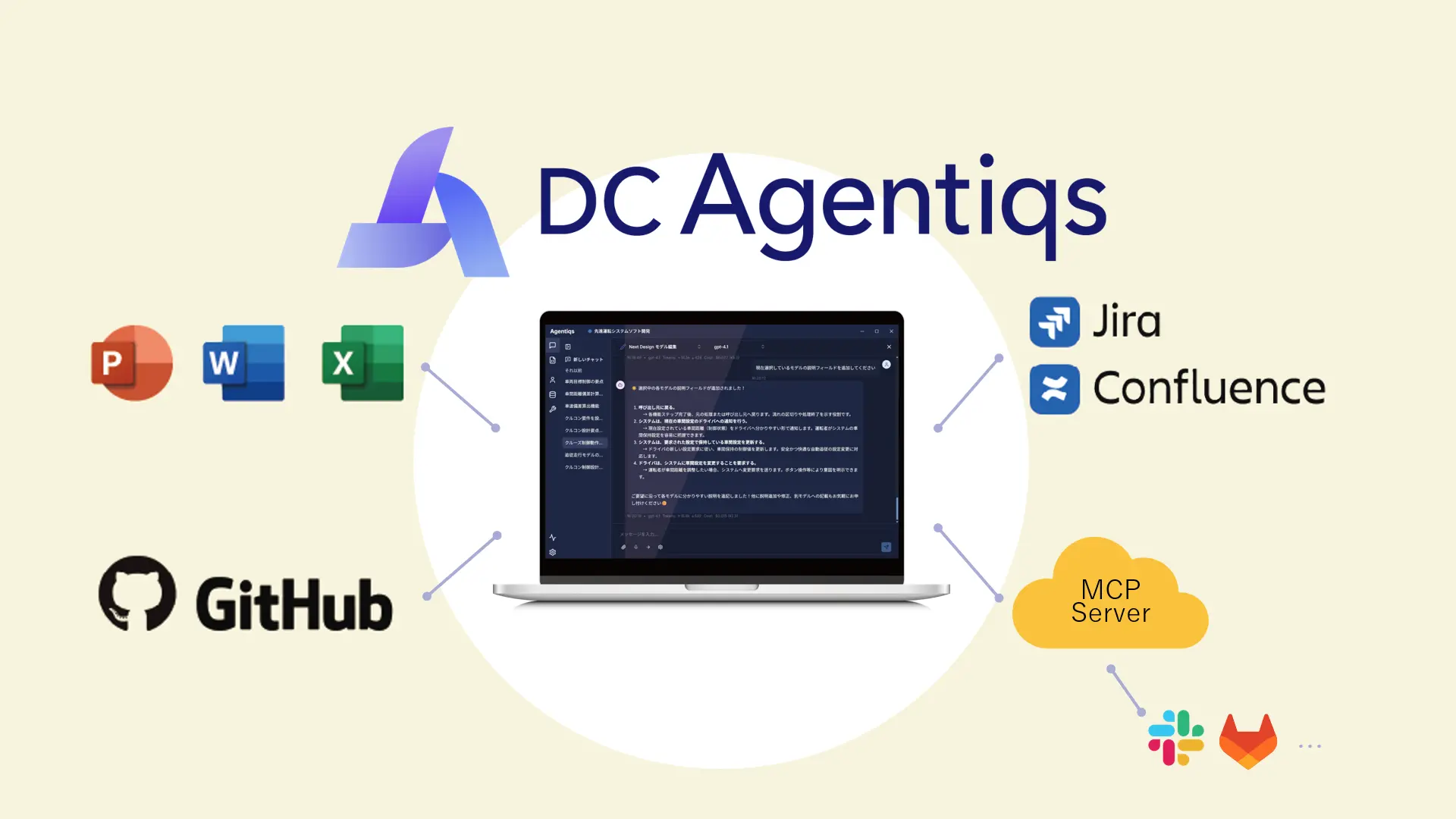 DC Agentiqs の「現場特化型エージェント」が、様々な開発ツールと連携し、現場の知識や成果物を活用してエンジニアのように成果物を作成します。